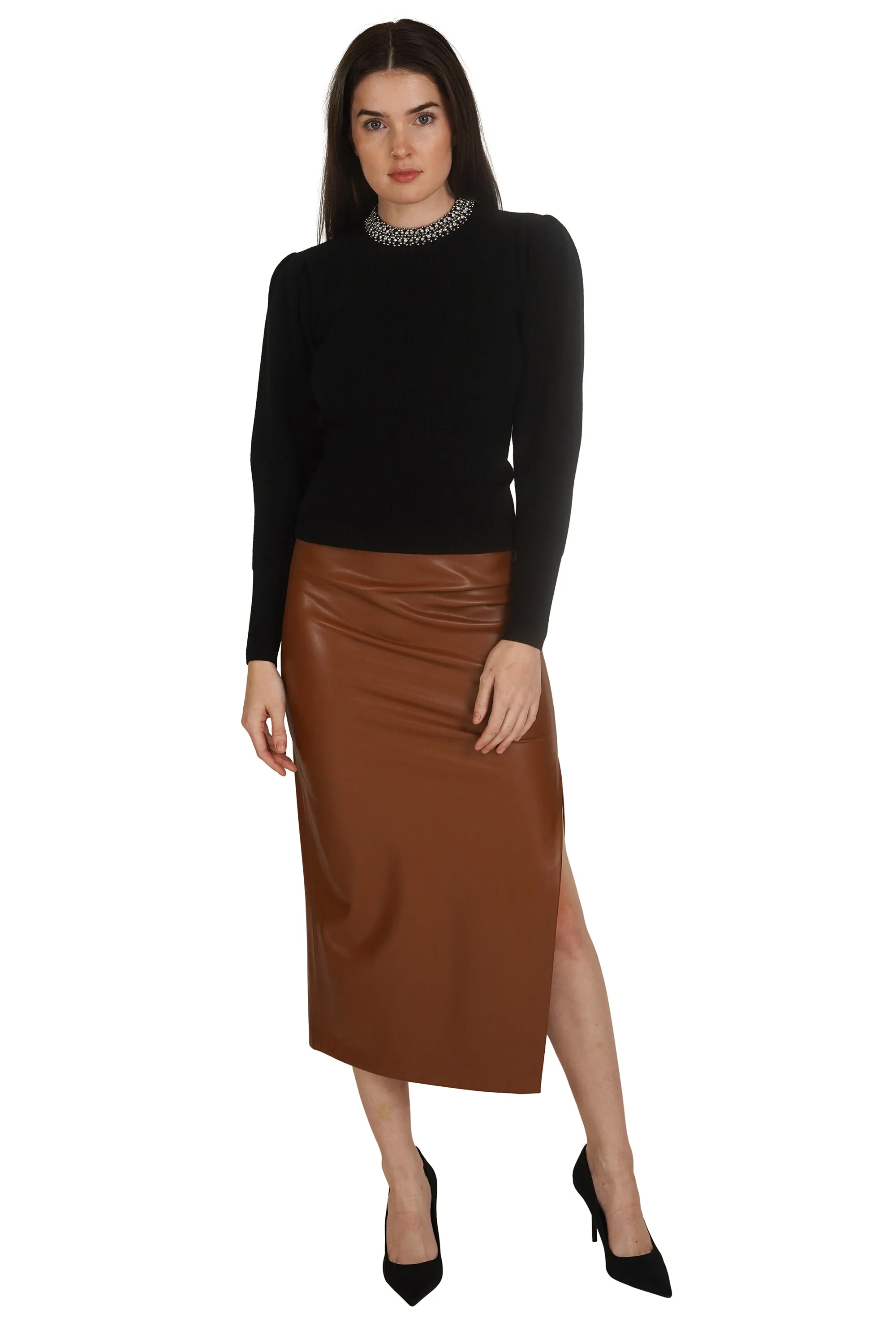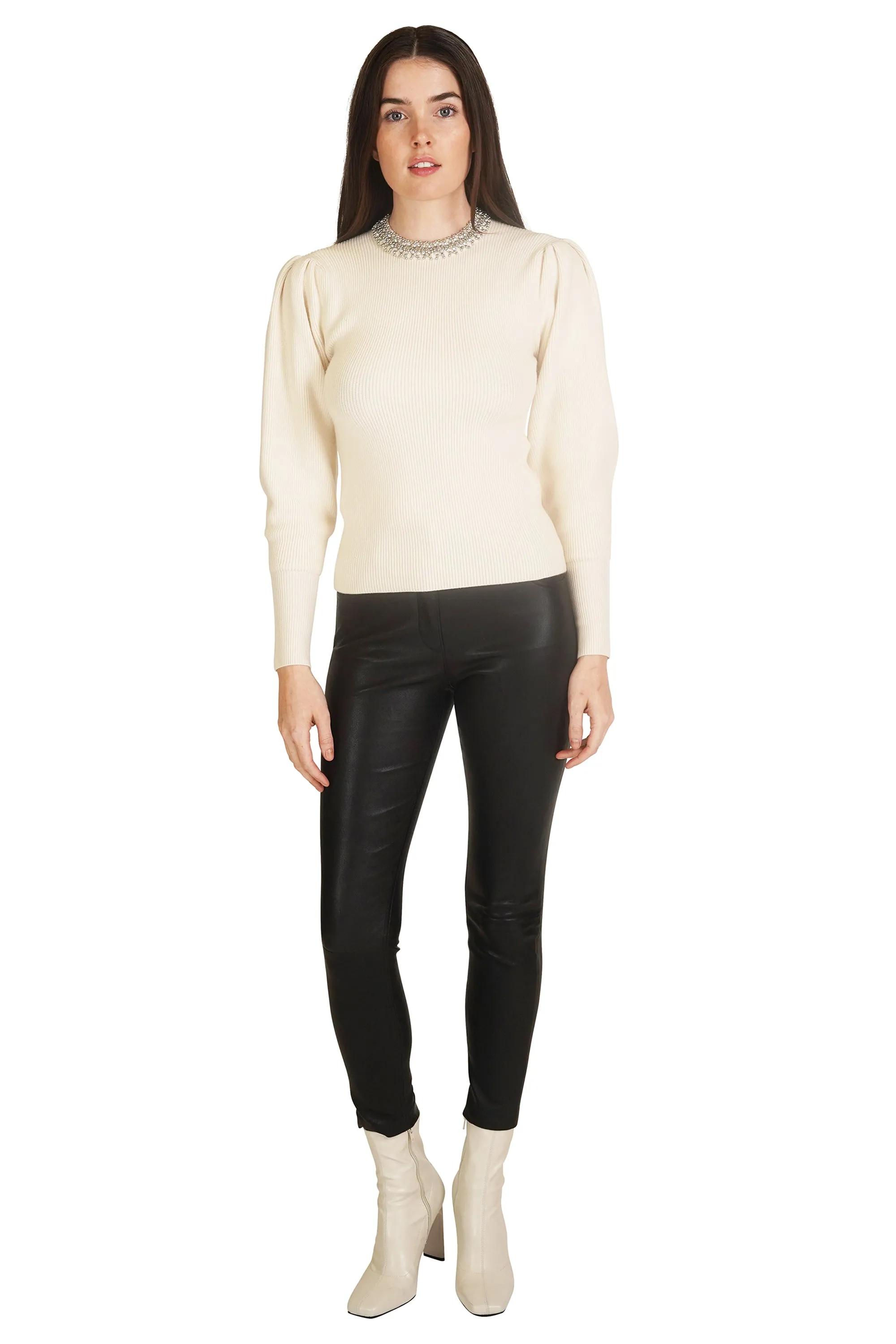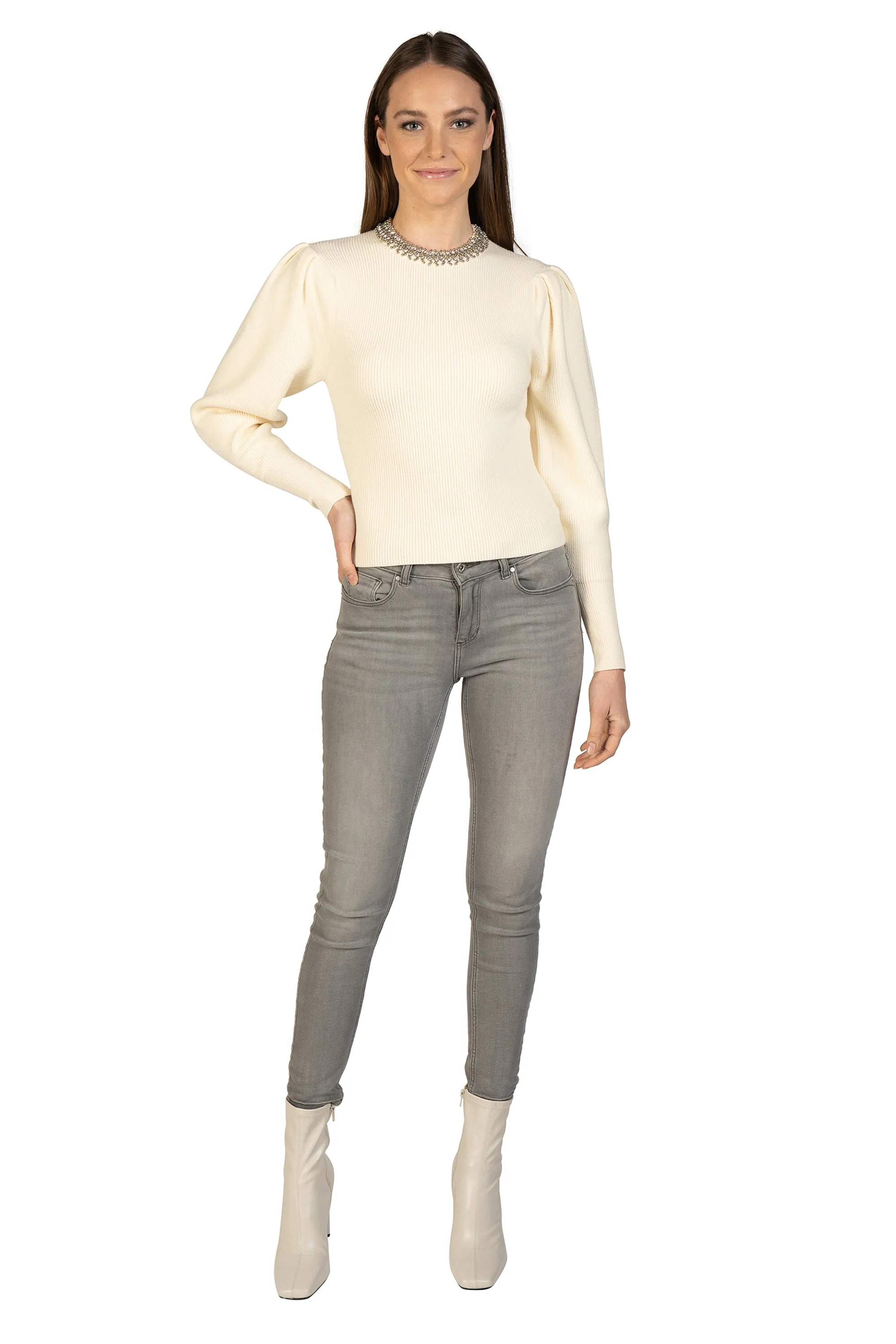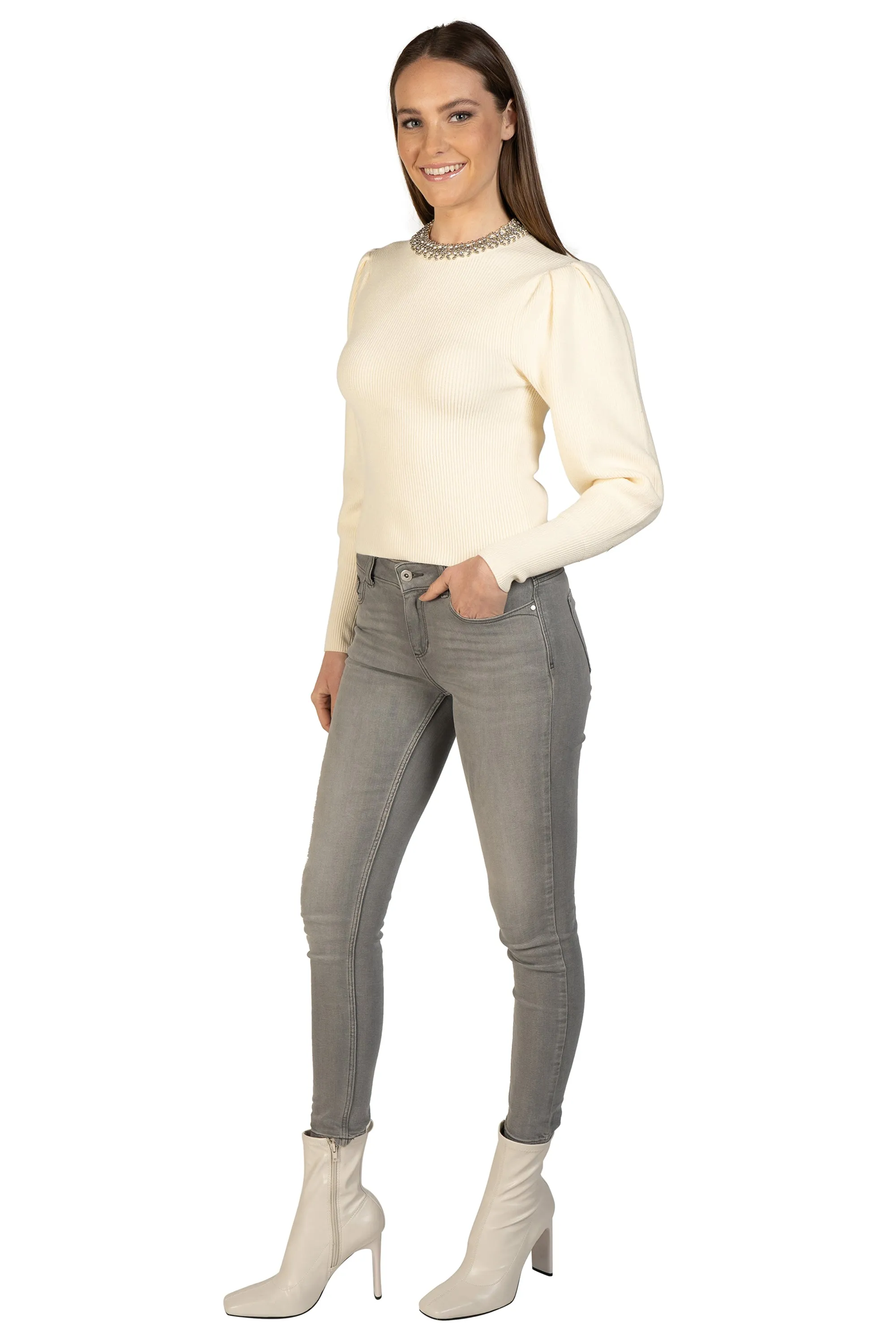 The sweater you reach for again and again. Beautiful jewel accents on the neckline give a sophisticated effortless look.